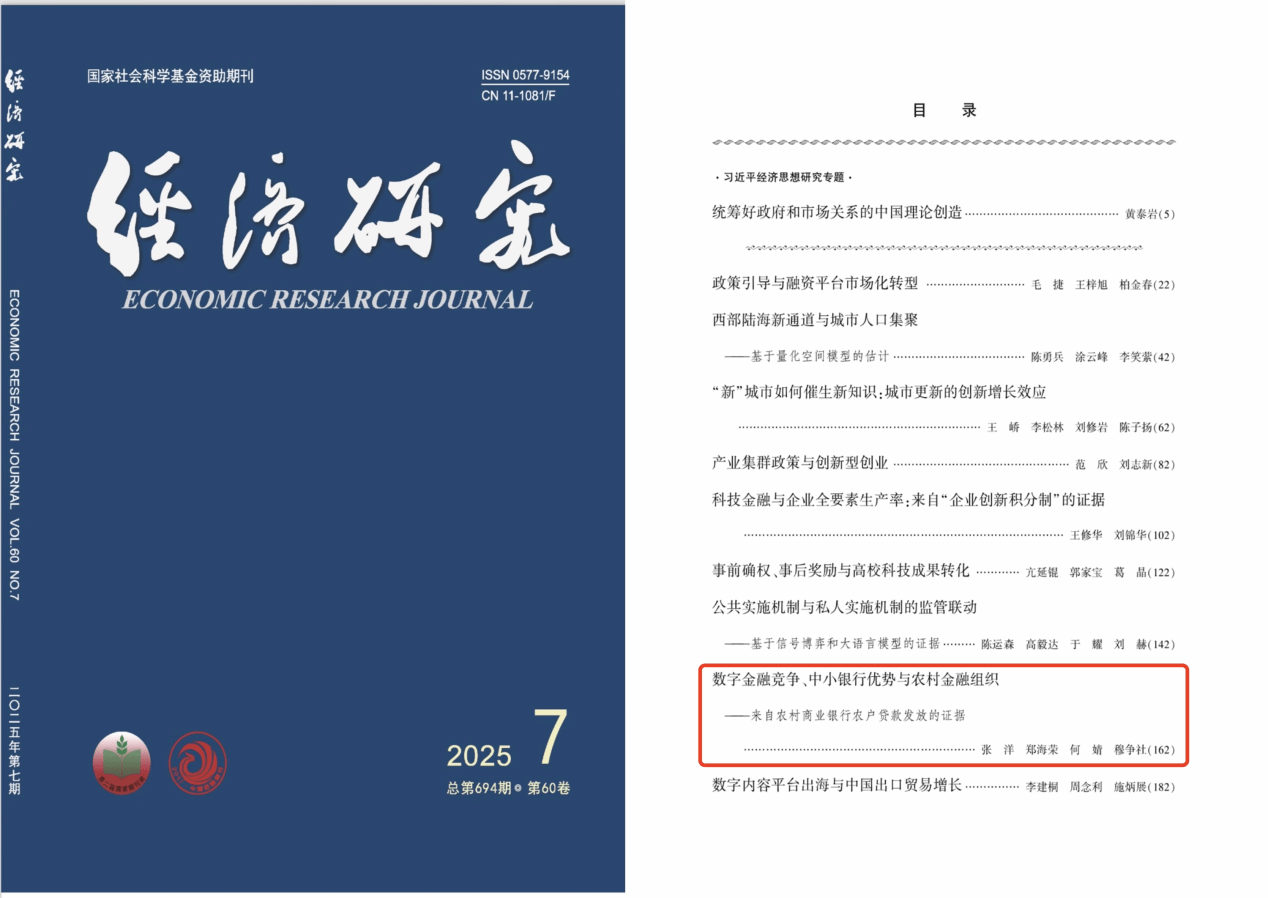 近日,800全讯白菜网青年教师张洋在数字金融领域的研究取得重要进展,研究成果《数字金融竞争、中小银行优势与农村金融组织——来自农村商业银行农户贷款发放的证据》在《经济研究》2025年第7期发表。此项研究旨在回应党的二十大报告提出的“健全农村金融服务体系”这一议题。数字金融发展对中小银行优势理论发起挑战,需重新审视大型银行与中小银行在农村金融组织体系中的角色与定位。在此背景下,该研究根据农户数字信息丰富度差异,将银行掌握的客户信息细分为传统型软信息、...