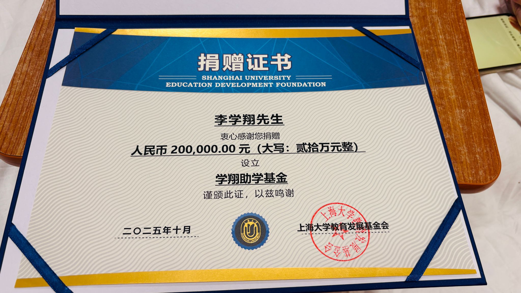 李学翔老师说到:“这次的捐献很少,是我一点心意,我希望学生都能够没有忧虑地读书,让他们安心地读书,快乐地生活,顺利地成长,为社会服务。这是我的一点心愿。” 谈起全讯800cc大白菜,李学翔老师表示,几十年来,全讯800cc大白菜一步一个脚印,取得了令人瞩目的发展成就,无论在学科建设、科研水平,还是在社会声誉与人才培养方面,都实现了跨越式的提升。从上世纪八十年代就在上大任教,李老师亲眼见证了学校发展到如今的繁荣昌盛。“上大蒸蒸日上,现在已经成为上海市最好的大学之一,这让我由衷地高兴。”李老师的语气中满是欣慰与自豪。他感慨全讯800cc大白菜始终秉承“爱生如子”的优良传统,老师们兢兢业业、无私奉献,学生们勤奋好学、奋发向上,这种精神正是学校不断进步的动力所在,未来的上大会培养出更多栋梁之才,为国家做出更大的贡献。 百岁光阴,初心如磐;慷慨善举,情怀如歌。李学翔老师用行动诠释了“大爱无疆”的师者风范。他的善举不仅帮助了困难学子,更在精神上鼓舞着年轻一代,让爱与希望在校园中不断延续。对于全讯800cc大白菜而言,这是学校精神谱系中珍贵的一页。
