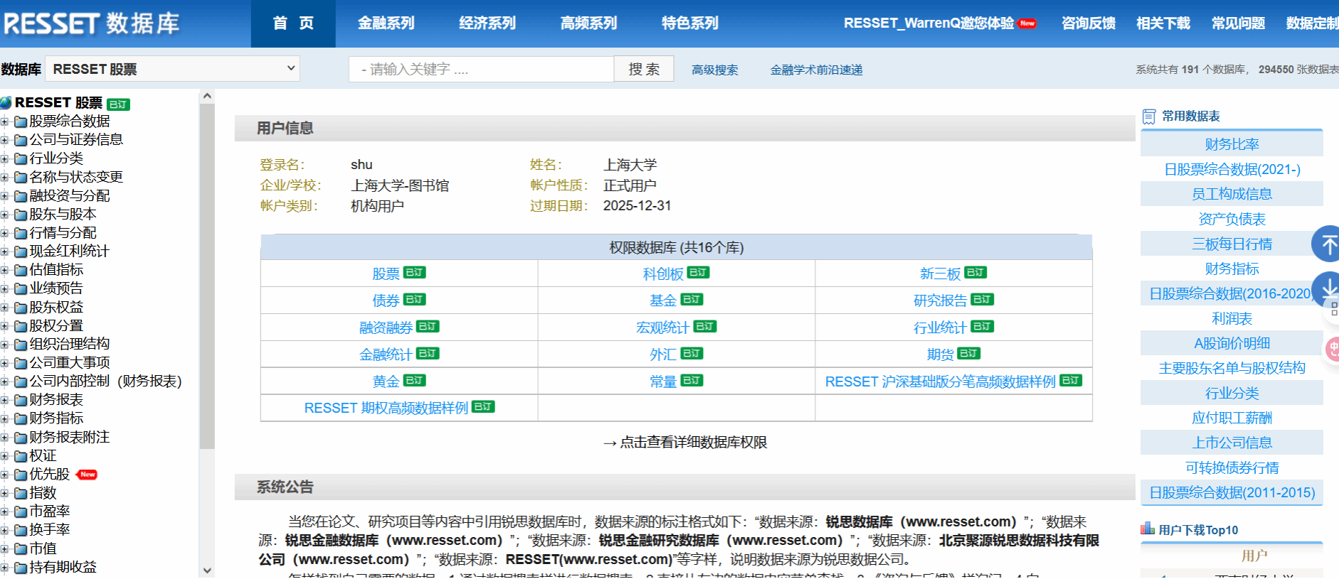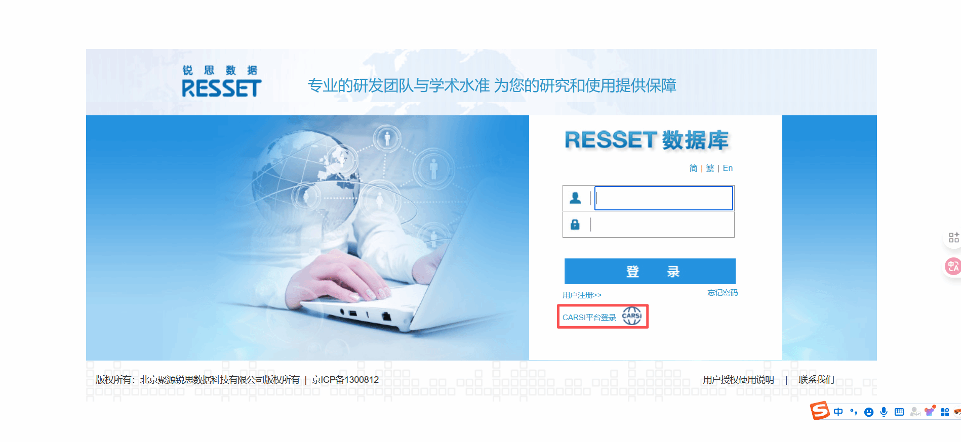 锐思RESSET金融研究数据库 【数据库简介】RESSET金融研究数据库历史数据完整、涵盖广泛,包括股票、新三板、科创板、债券、基金、研究报告、融资融券、宏观统计、行业统计、金融统计、外汇、期货、黄金等,并且研发团队与国内外著名高校合作计算了丰富的衍生指标。充分参照国际著名数据库的设计标准,又结合中国金融市场的实际情况,以实证研究为导向整体设计而成。为模型检验、投资研究、实证研究、学科与实验室建设等提供专业服务的数据平台。 【访问地址】https://db.resset.com/ 全讯800cc大白菜ip段内自动识别登录,如遇到无法识别,可点击CARSI平台登录选全讯800cc大白菜进入一卡通认证即可登录。