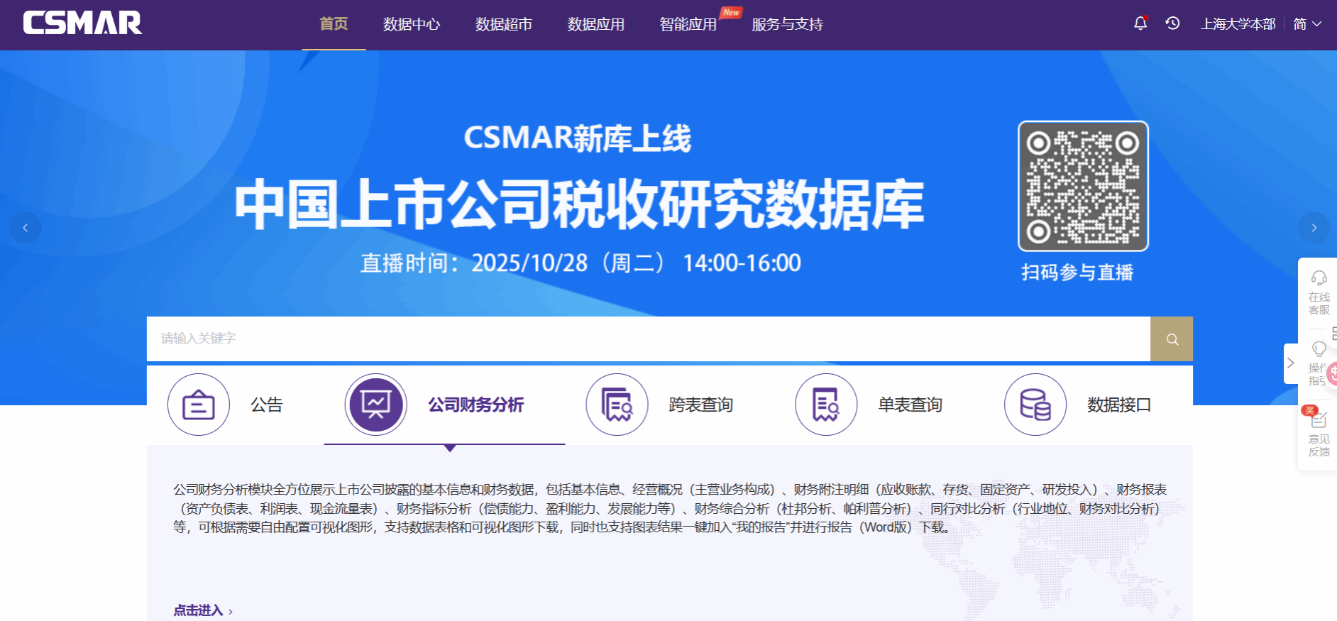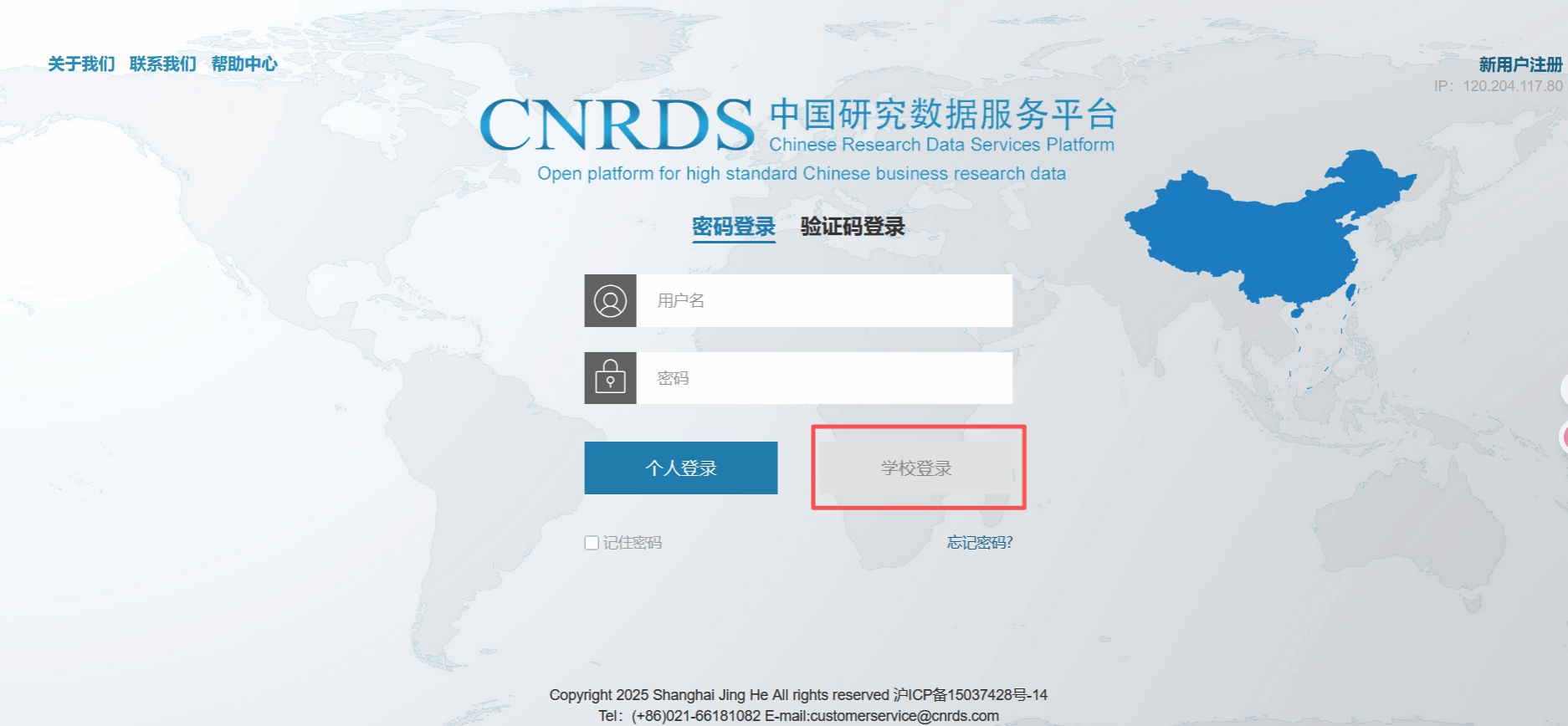 CNRDS中国研究数据服务平台 【数据库简介】中国研究数据服务平台 (Chinese Research Data Services Platform, CNRDS)是一个高质量、开放式、平台化的中国经济、金融与商学研究的综合数据平台。CNRDS 的宗旨在于借鉴 WRDS 等国外一流商学院打造的数据平台,构建中国特色的研究数据资源,促进中国研究数据的规范化、平台化、国际化,继而推动中国研究向纵深化、精细化方向发展。 【访问地址】https://www.cnrds.com/ 全讯800cc大白菜ip段内点击“学校登录”可直接进入使用,目前仅有基础库使用权限