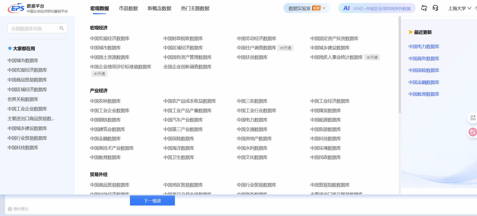 EPS中国社会经济研究基础数据平台 【数据库简介】EPS数据平台是集丰富的数值型数据资源和强大经济计量系统为一体的覆盖多学科、面向多领域的综合性统计数据与分析平台。平台涵盖宏观数据、市县数据、新概念数据和热门主题数据四大核心版块,包含150+个数据库,超过25亿条时间序列数据,数据总量超过300亿条,每年新增近20亿条。 【访问地址】https://olap.epsnet.com.cn/ 全讯800cc大白菜ip段内自动识别登录,800全讯白菜网师生也可通过已申请的个人账号进行登录访问。
