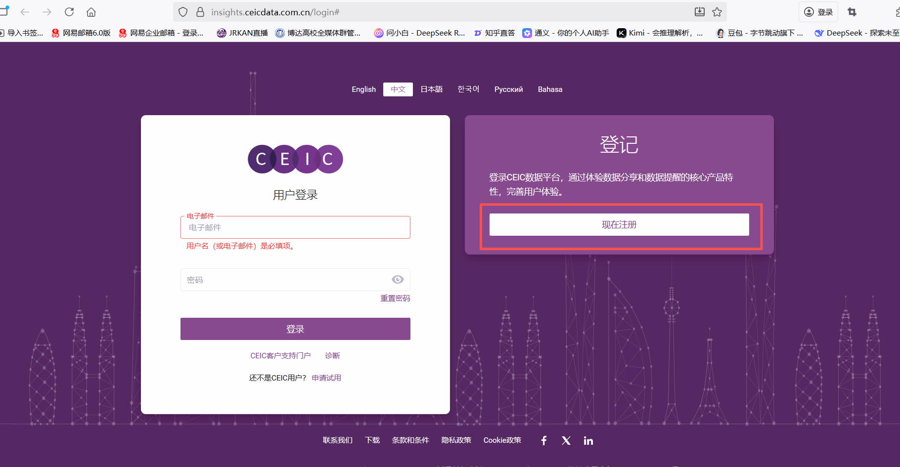 CEIC经济金融数据库 【数据库简介】CEIC 成立于 1992 年,由经济学家和分析师组成,提供有关世界发达经济和发展中经济的广泛、精确的信息。数据库覆盖 200 多个国家与地区的超过 660 万条时间序列数据,CEIC 有超过 2200 家数据来源,如,官方统计机构:国家统计局、国际基金货币组织、世界银行、经济合作与发展组织等;行业协会:世界钢铁协会,全球半导体联盟;金融信息提供商:道琼斯、标准普尔等。 【访问地址】https://insights.ceicdata.com.cn 全讯800cc大白菜ip段内点击“现在注册”,填写相关信息注册个人账号后即可登录使用。